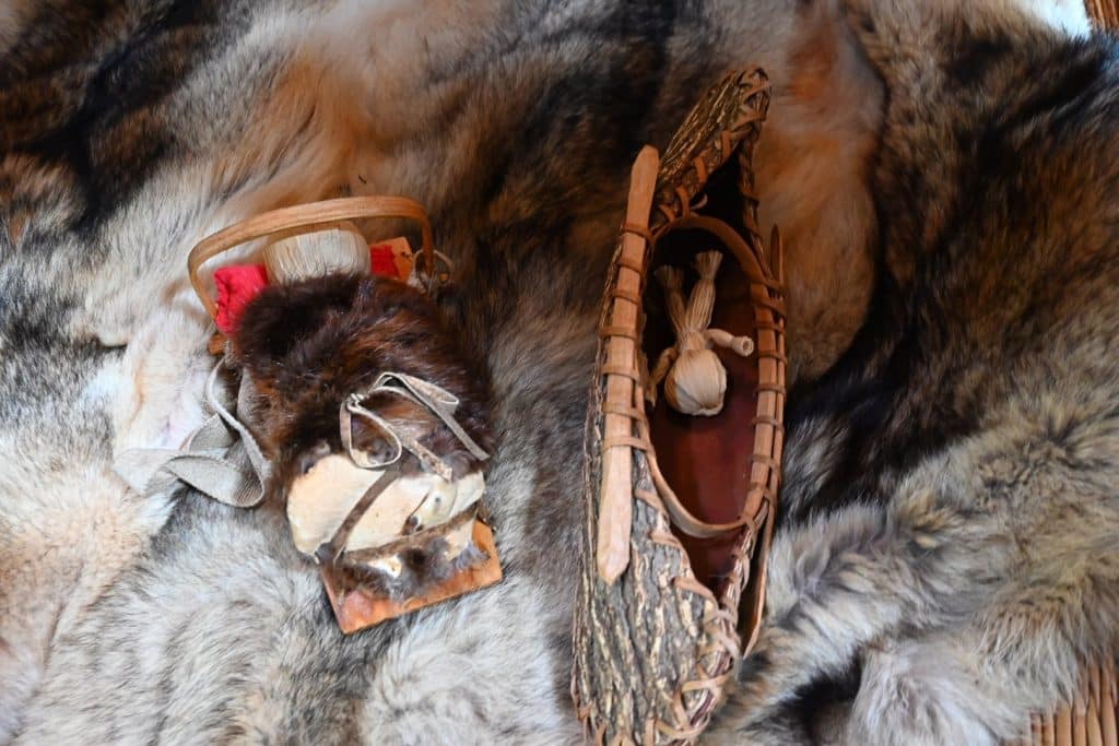 An agricultural powerhouse, Ganondagan was composed of 150 houses, each housing a family unit of around 12-40 people. The surrounding fields produced a majority of the corn, squash and beans (called the “Three Sisters” by “the nations”) for the area. One of the longhouses has been reconstructed based upon the archeological evidence and historical writings to its original likeness. Inside the nearly two story structure one finds that it has been meticulously decorated in furnishings, personal items, and tools so as to look like the inhabitants stepped out only moments earlier. Fire hardened tree poles driven into the ground and lashed together with long strips of bark that was then covered with large panels of unrolled tree bark that was then woven into the frame made a weatherproof dwelling. A large open seam in the apex allowed for smoke to escape from a series of fires built in the middle of the longhouse between bunk beds located along the walls. Large doors were located at each end of the longhouse. Inside it is easy to imagine an extended family living together in an environment with no privacy that did not allow many secrets, grudges or anger to fester.
