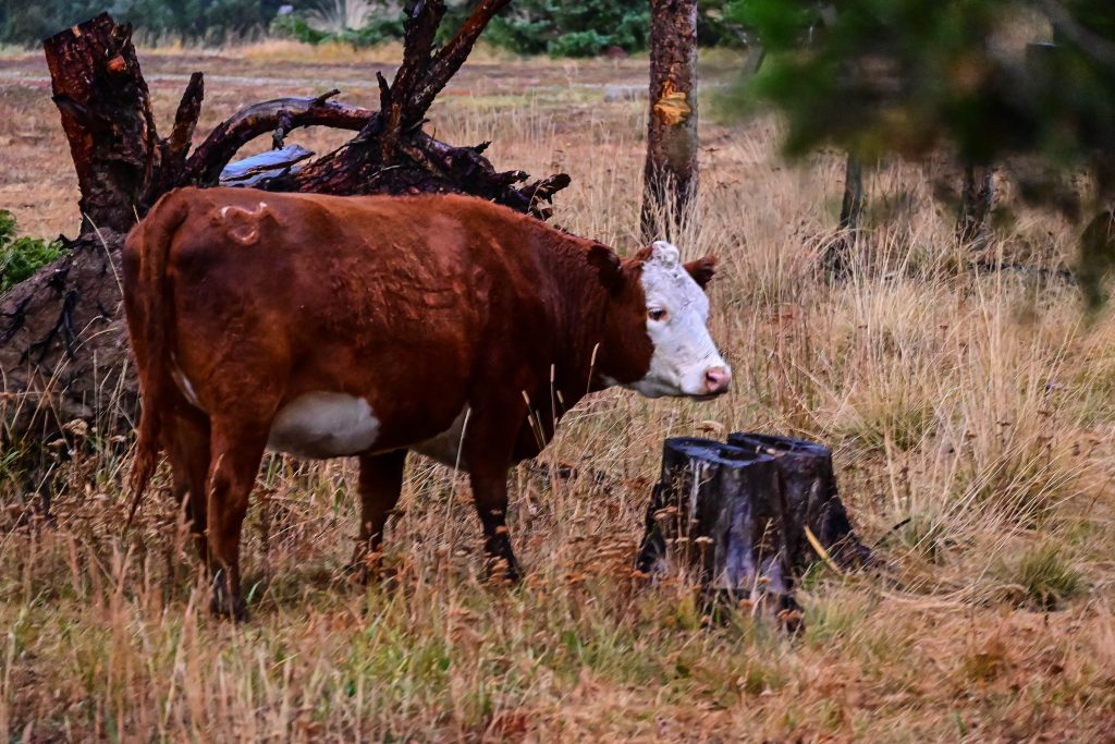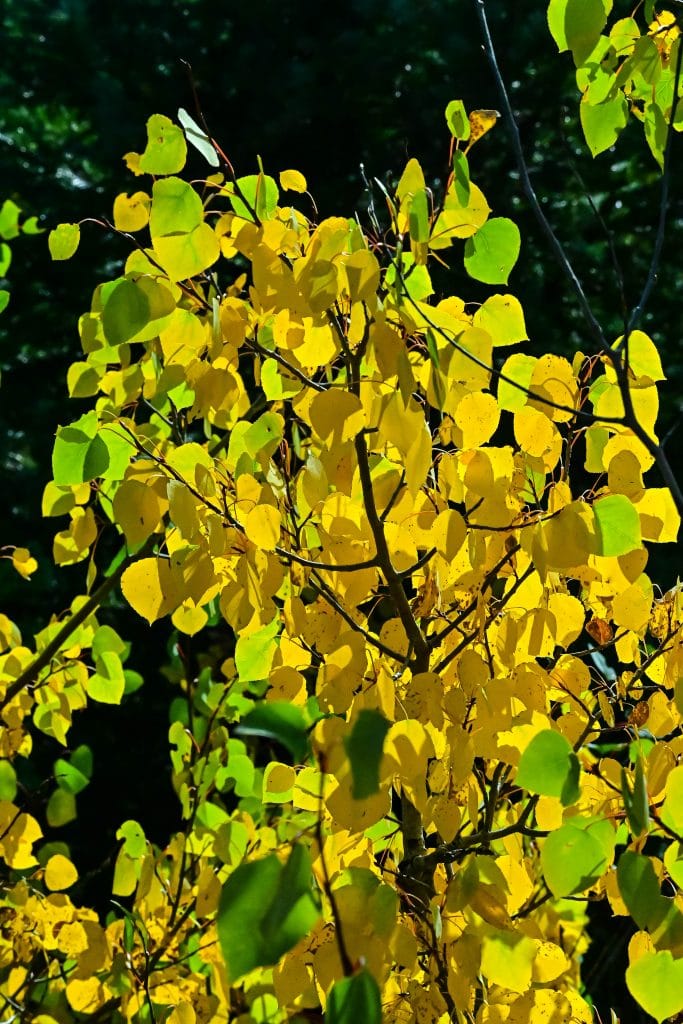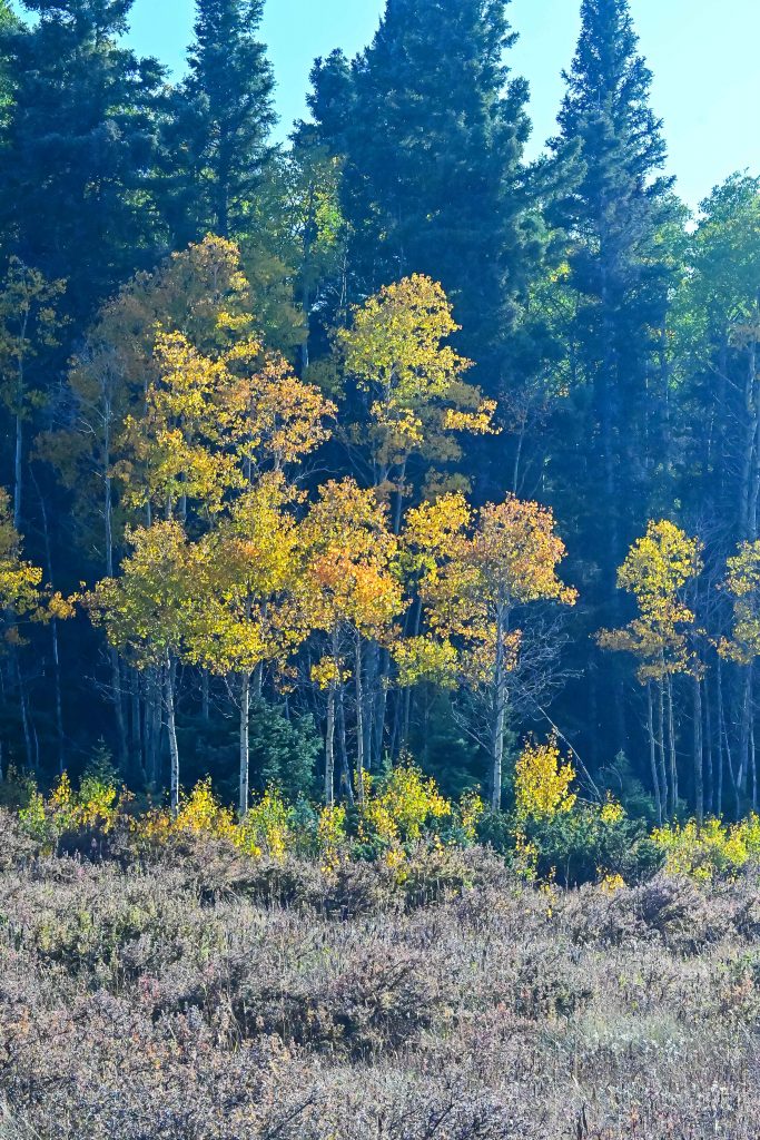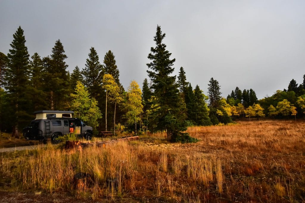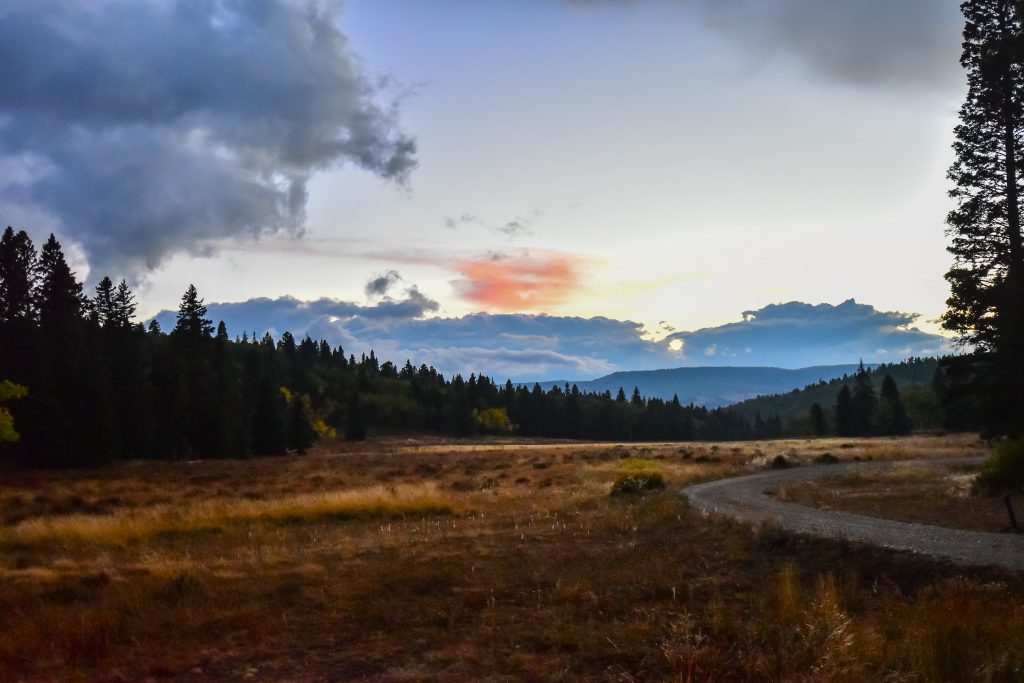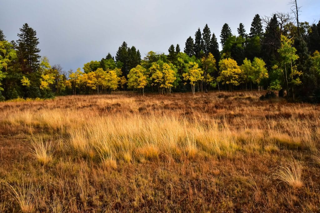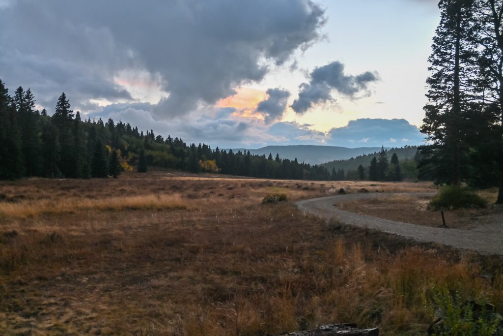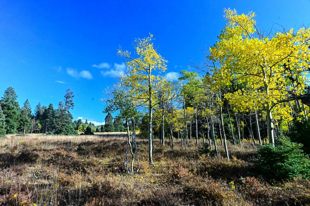 After Mills Canyon we wanted to try and go into some higher elevations in the national forest in hopes of seeing some fall colors. As we researched where to go we were finding that many of the national forest campgrounds were closed or about to close for the season. We did find a beautiful campground in the Carson National Forest, Hopewell Lake, at an elevation of 9500 feet. It was very cool and windy when we arrived and rain came in during the night. We shared the campground with a herd of cows and a friendly dog named Charlie that belonged to the only other campers in our loop of the campground. We were rewarded with beautiful views of mountains, colorful aspens quaking in the breeze, golden grasses, and an amazing sunset. David even took a short hike on the Continental Divide Trail!