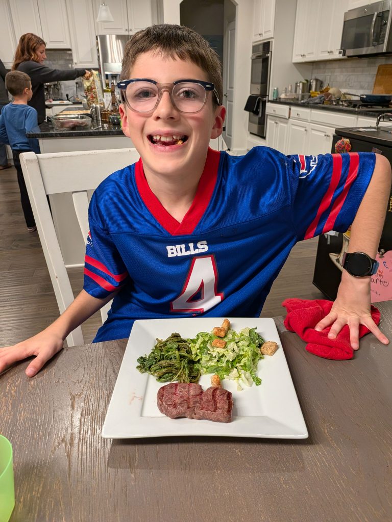 Later that afternoon after the bus deposited the boys we all went in the house where we built puzzles, played darts, Scrabble, had a Paka Battle, did some light block building and the associated destruction thereof, played several hands of solitaire, watched “Is it cake”, played darts, played pool and read books before bedtime…. NOT! First we partook in Vinny’s birthday dinner of steak, Cesar salad, and wilted greens.