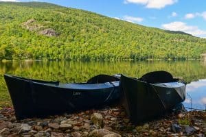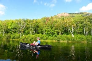 Gabe, the ranger stationed at South Branch Campground, stood near the wheeled boat dock on Lower South Pond addressing the crowd of about one dozen